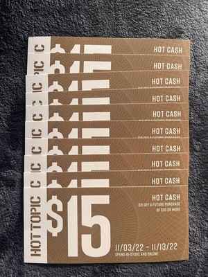50% Off Hot Topic Coupons & Promo Codes - November 2022 Coupon Code $15 off $15 off purchases of $50 Get Code $15 avg saved 228 used today Ends Nov. 30, 2022 Sale 30% off Up to 30% off any purchase when you spin the wheel & sign up for HotTopic.com's newsletter Details Get Coupon $4 avg saved 68 used today Ends Nov. 30, 2022 New CouponCabin Members Only 25% back New 30% off + 25% bonus on any purchase